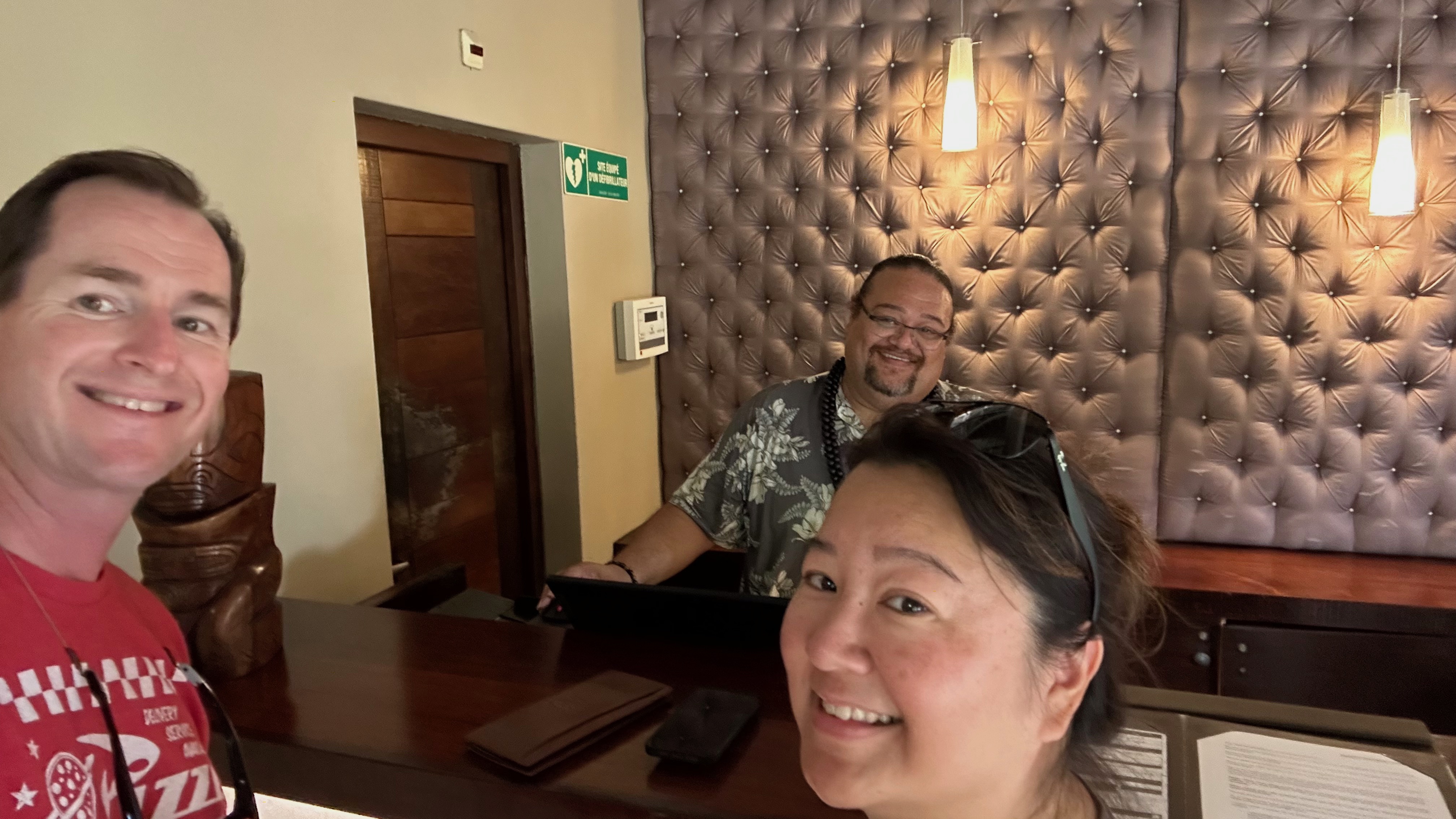 Any way the process did seem to take a while but we didn’t mind as we just took in the beauty all around us. They opened the slider doors and let in the breeze as it was a pretty windy day and it felt so nice….there is no AC in the lobby, it’s all open-air. Finally, a young gentleman came up to us and thanked us for being IHG Ambassador members, and had us fill out a check-in form which was a bit strange since it was all information they should have already had, but everyone had to fill one out. He also asked to see my Costco booking itinerary which I only had in my email but I was able to email it to him without issue. About 15 minutes later he came back and said our room was not yet ready and apologized profusely (it was only around 11AM and official check-in time was 3PM). We told him no problem, we would go eat lunch at Lucky House which was just around the corner. He gave us buzzers like the ones you’re given at restaurants to let you know when your table was ready. Todd handed his backpack over to bell services and we were off!
