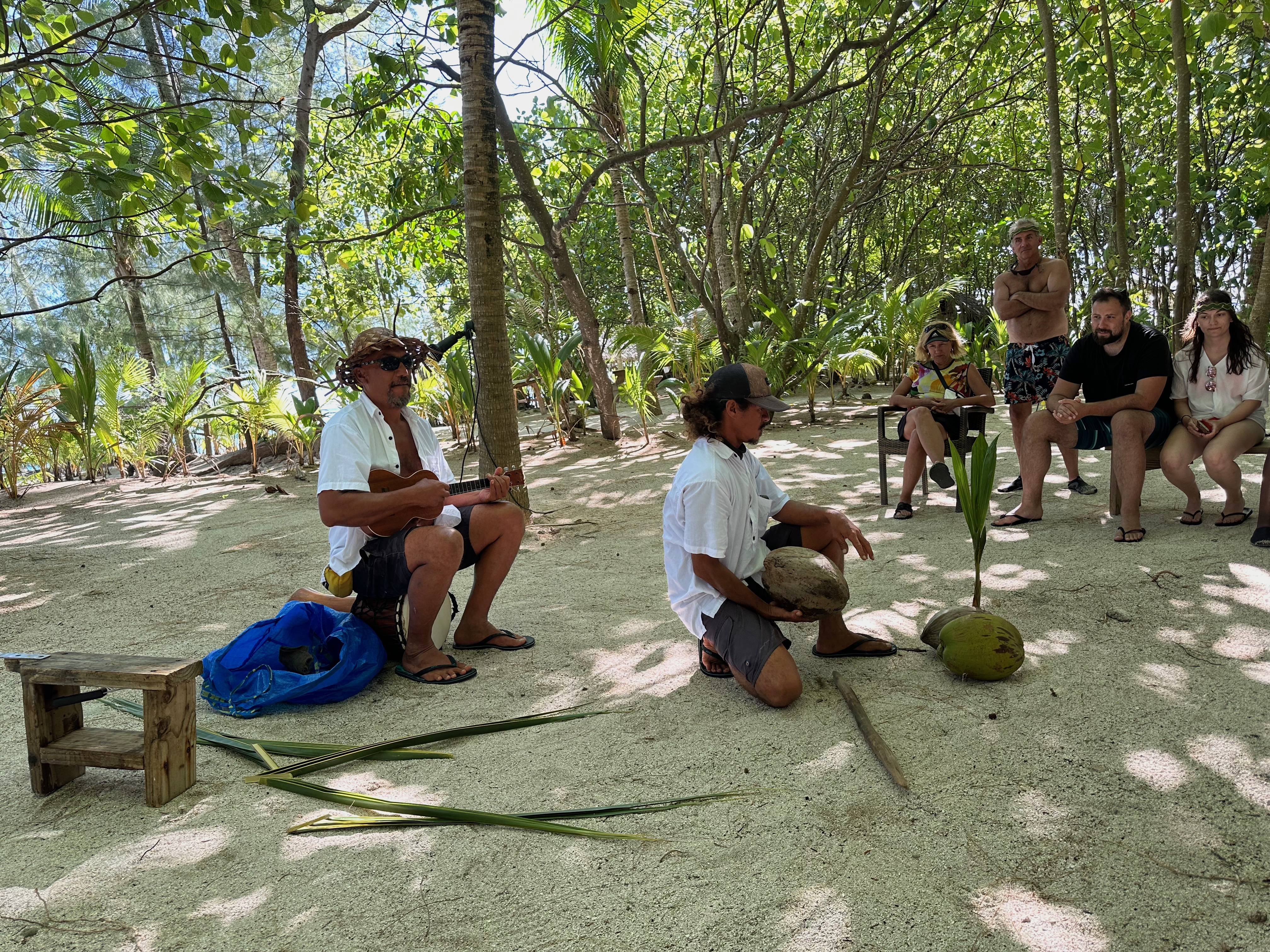 We were then taken to a private motu where a super delicious lunch was waiting for us. We were all given handmade plates to fill up with grilled fish, chicken, steak, and all sorts of sides, fresh fruit, coconut bread, and banana pudding dessert! My favorite was the chicken and I normally never willfully order chicken when I go out to eat. It tasted like it was teriyaki-glazed and was so yummy. We shared picnic tables in the water, with fish circling our ankles and a resident stingray swimming back and forth. There was water and soda for beverages. After lunch we got a very entertaining lesson on all things coconut….the different stages of a coconut, how to open them, how to make coconut milk, braiding the fronds for a variety of uses from hats to shoes to plates. Coconut trees are basically the ultimate natural resource.