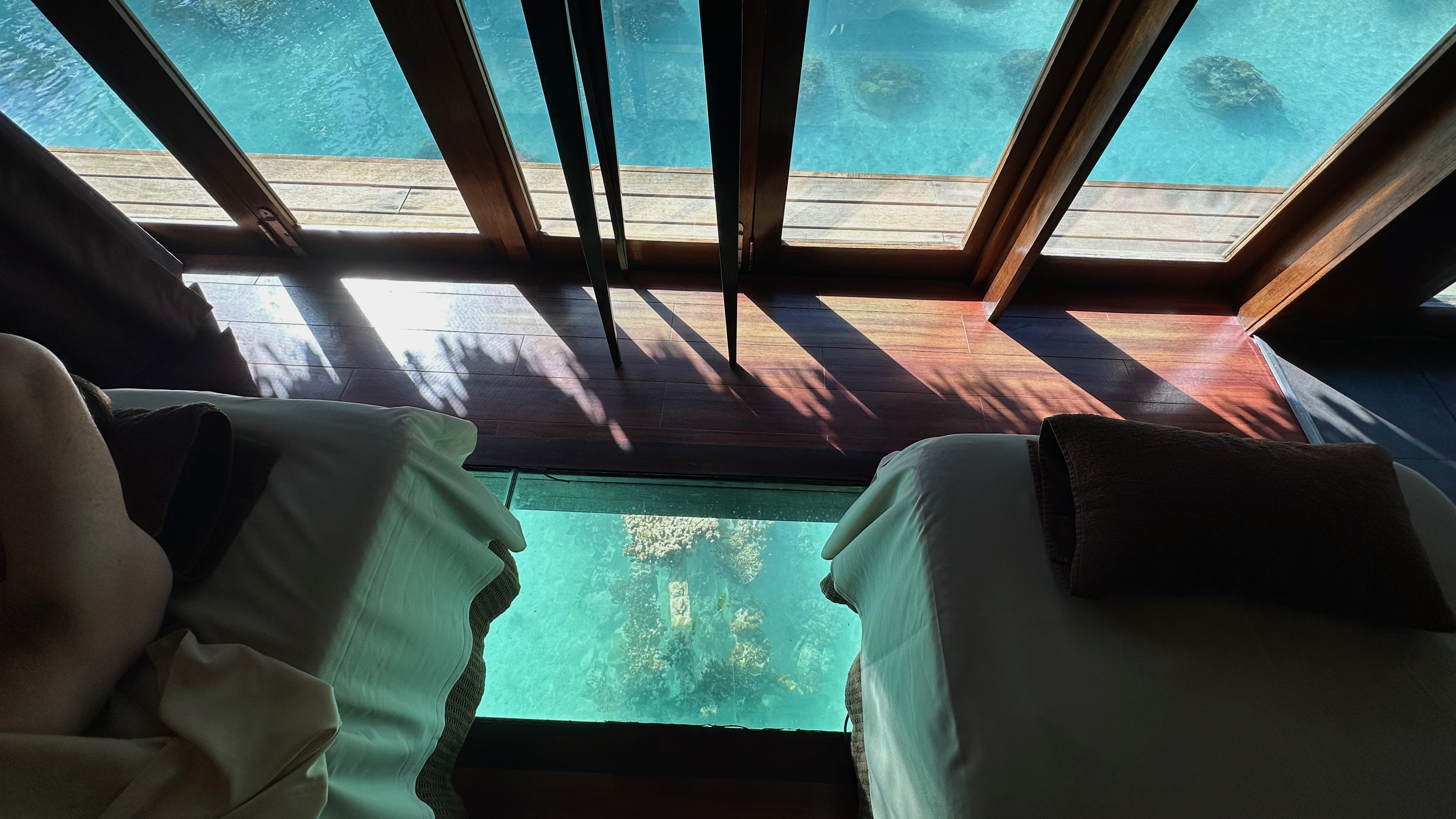 The location was perfect, about midway from the main area of the resort and the end of the pontoon. It was nicely distanced from other bungalows. Stephanie gave us a tour of the room and it was a nice comfortable size with a separate living area and bedroom, and a nice sized closet and bathroom, with two sinks, a separate shower and tub, and a separate water closet (toilet room). The deck was large and the view was phenomenal, but I believe it honestly is great from anywhere here. There is a glass window coffee table where you can view fish from the living room. It also slides open for feeding.