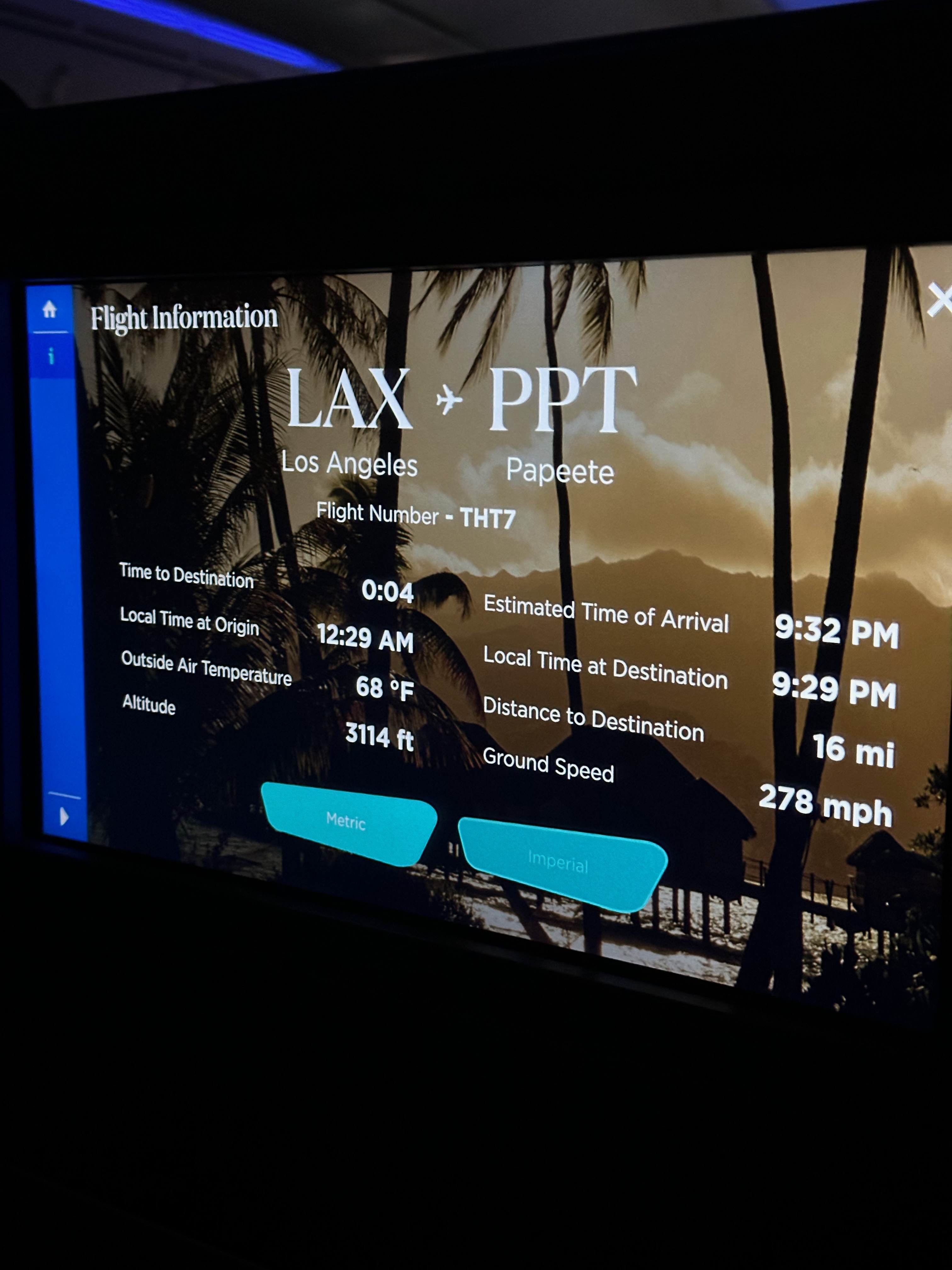 The service on the flight was amazing. We were given tiare flowers and the whole cabin smelled amazing. The flight attendants were attentive without being intrusive and were so genuinely friendly and gracious. We felt so spoiled for sure.